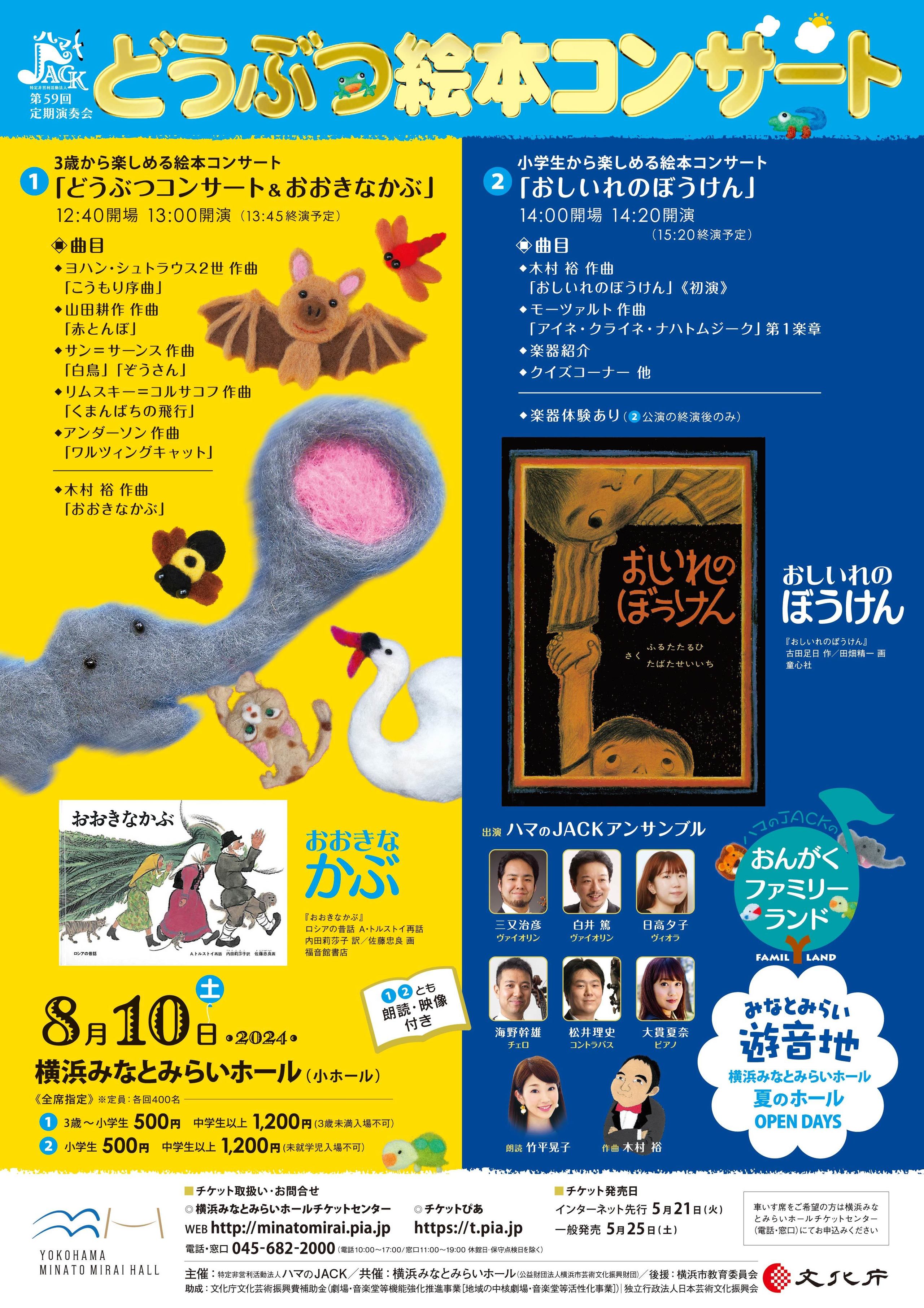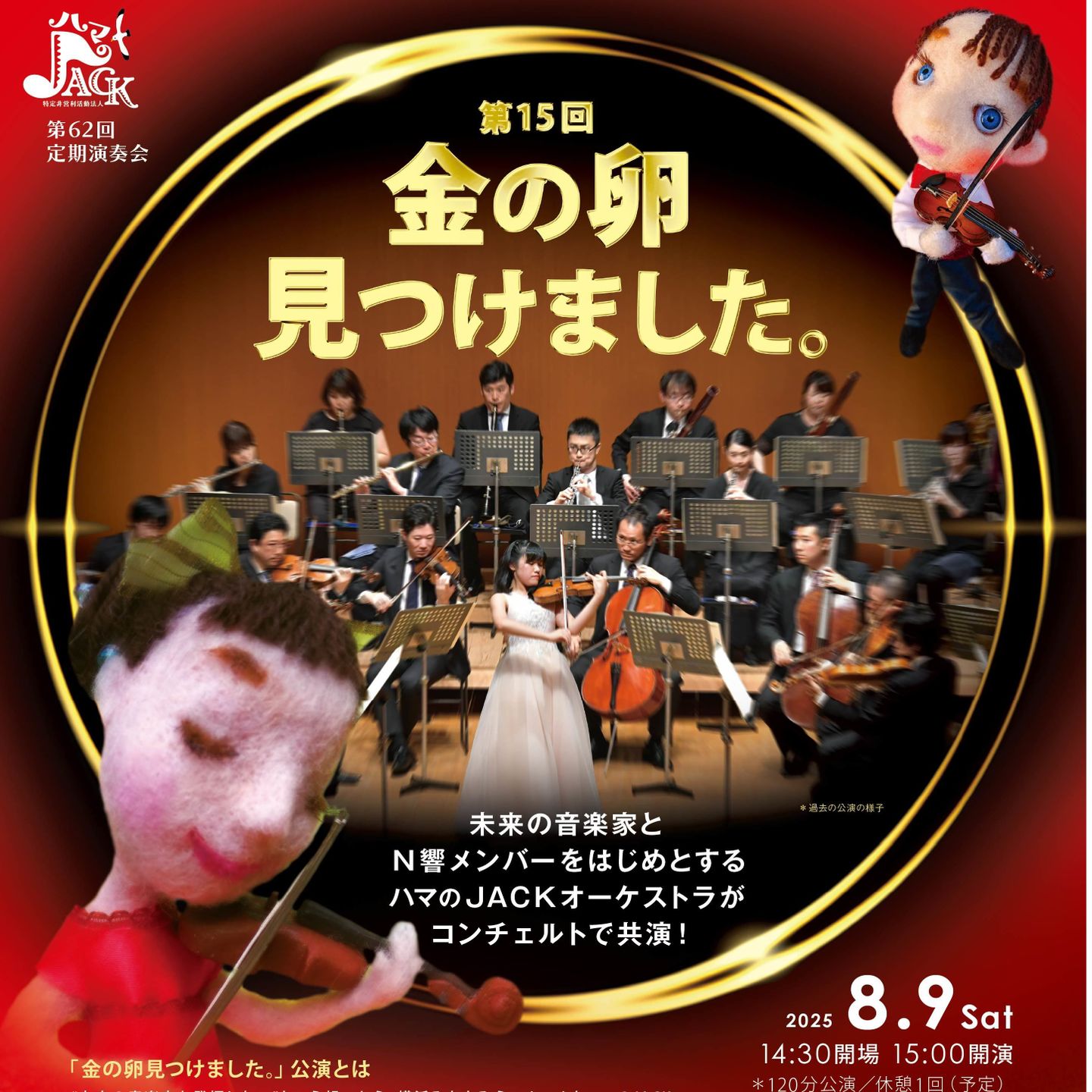 ハマのJACKがお届けする演奏会 金の卵見つけました演奏会 コンチェルトソリストオーディション合格者による演奏会 コンチェルトソリストオーディションにて合格した小さなソリスト《金の卵たち》が出演する演奏会。 近年では過去の受賞者がOB/OGとして出演。合格後の素晴らしい成長もお聴き頂いております。 またオーディションにてJACK賞を受賞した方による《JACK賞受賞者演奏会》も開催されています。 みなとみらい遊音地 0歳のお子様からご家族みんなで楽しめます 夏休みに、毎年横浜みなとみらいホールで行われている《みなとみらい遊音地》 ハマのJACKのコンサートも毎年、お子様連れのお客様に楽しんで頂いております。 0歳から入れる《おんがくベビーランド》、朗読付きの絵本コンサートや、楽器のことを学びながら 名曲が聴ける《おんがくファミリーランド》などを開催しております。 クリスマスキャロルコンサート ハンドベルワークショップで演奏会を彩ります ハマのJACKの活動の原点となるクリスマスキャロルコンサート。国の重要文化財である《横浜市開港記念会館》にて行っております。近年では別会場でも開催。ハマのJACKアンサンブルと横浜少年少女合唱団が歌うクリスマスキャロルは格別です。開演前にはハンドベルワークショップも行っており、リピーターがとても多い公演です その他の公演 その他、ハマのJACKではご依頼を受けての演奏会も数多く行っております。保育園や学校への訪問演奏や、区主催の記念コンサートなど、様々な編成でお届けします。 ページトップへ 今後予定している演奏会 クリスマスキャロルコンサート@杉田劇場 クリスマスキャロルコンサート@横浜市開港記念会館 金沢区音楽振興事業公演