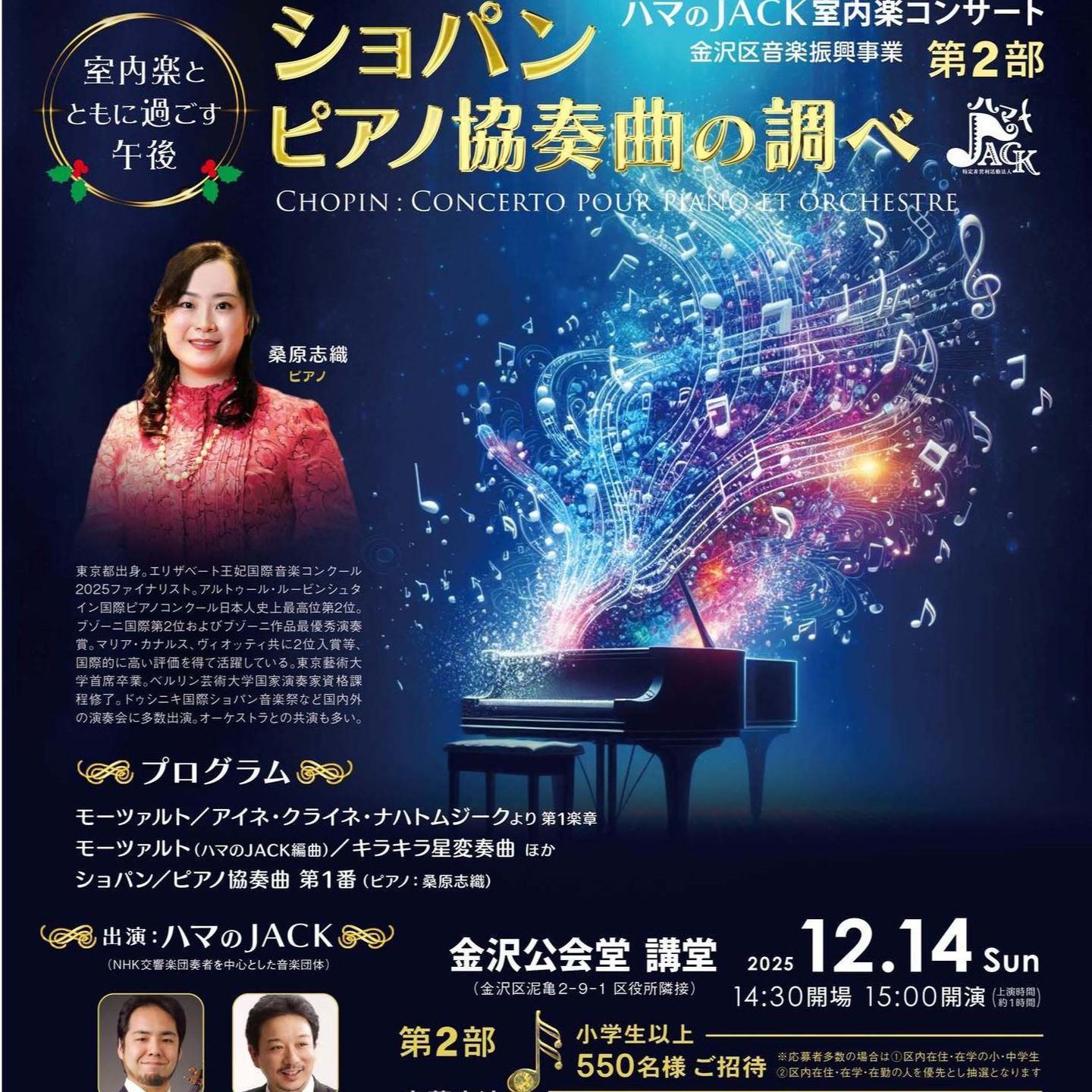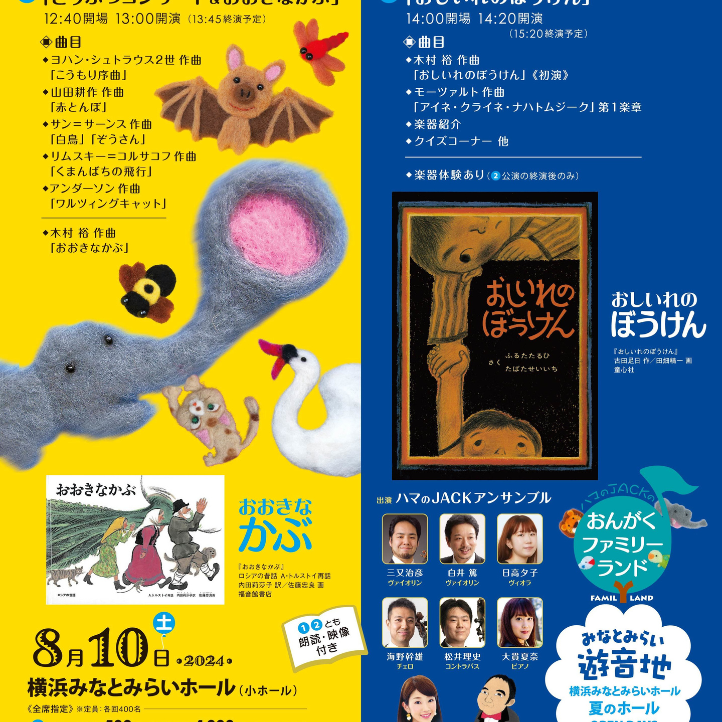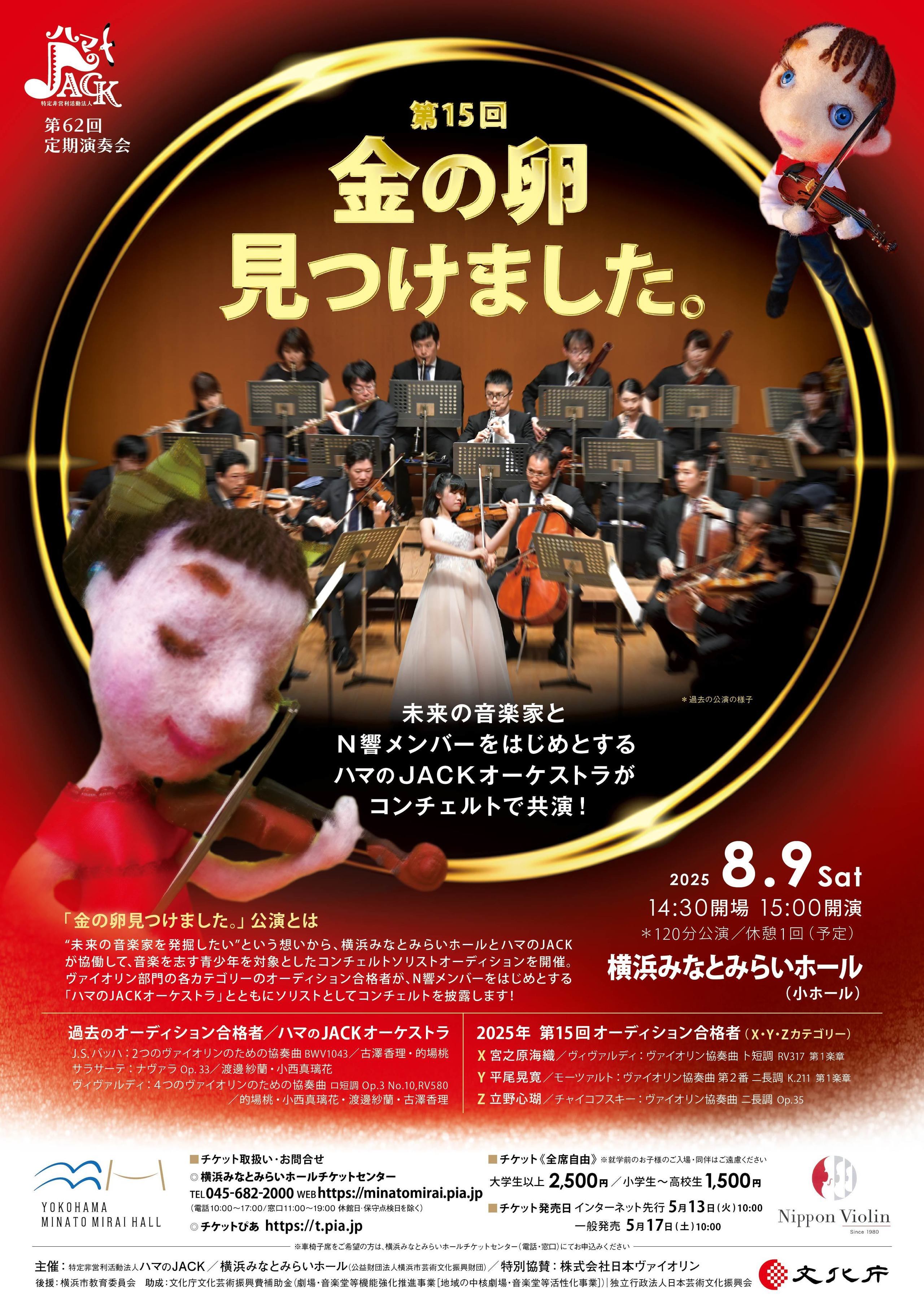 ハマのJACKがお届けする演奏会 金の卵見つけました演奏会 コンチェルトソリストオーディション合格者による演奏会 コンチェルトソリストオーディションにて合格した小さなソリスト《金の卵たち》が出演する演奏会。 近年では過去の受賞者がOB/OGとして出演。合格後の素晴らしい成長もお聴き頂いております。 またオーディションにてJACK賞を受賞した方による《JACK賞受賞者演奏会》も開催されています。 みなとみらい遊音地 0歳のお子様からご家族みんなで楽しめます 夏休みに、毎年横浜みなとみらいホールで行われている《みなとみらい遊音地》 ハマのJACKのコンサートも毎年、お子様連れのお客様に楽しんで頂いております。 0歳から入れる《おんがくベビーランド》、朗読付きの絵本コンサートや、楽器のことを学びながら 名曲が聴ける《おんがくファミリーランド》などを開催しております。 クリスマスキャロルコンサート ハンドベルワークショップで演奏会を彩ります ハマのJACKの活動の原点となるクリスマスキャロルコンサート。国の重要文化財である《横浜市開港記念会館》にて行っております。近年では別会場でも開催。ハマのJACKアンサンブルと横浜少年少女合唱団が歌うクリスマスキャロルは格別です。開演前にはハンドベルワークショップも行っており、リピーターがとても多い公演です その他の公演 その他、ハマのJACKではご依頼を受けての演奏会も数多く行っております。保育園や学校への訪問演奏や、区主催の記念コンサートなど、様々な編成でお届けします。 ページトップへ 今後予定している演奏会 クリスマスキャロルコンサート@杉田劇場 クリスマスキャロルコンサート@横浜市開港記念会館 金沢区音楽振興事業公演